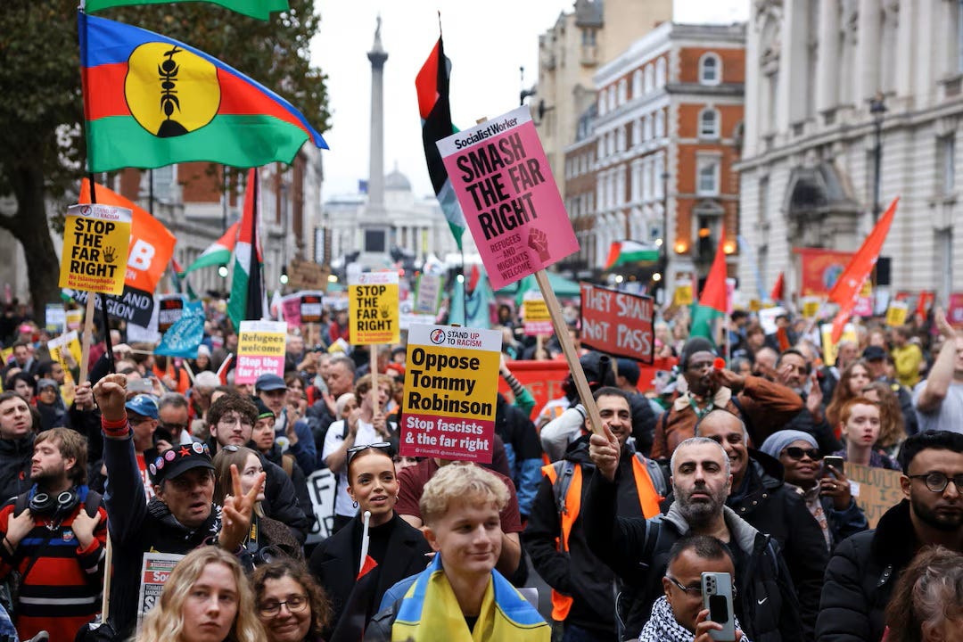 That is not a rounding error. That is a tenfold discrepancy. The difference between the population of Bristol and the population of Loughborough. You have always known those are not the same place. For context: the Tommy Robinson-led Unite the Kingdom rally in September 2025 — the largest far-right, (whoever they’re supposed to be on any given day) mobilisation in British history, by most accounts — drew between 110,000 and 150,000 people. The Together Alliance claimed to have dwarfed it by a factor of three. The Metropolitan Police suggested they barely matched it.