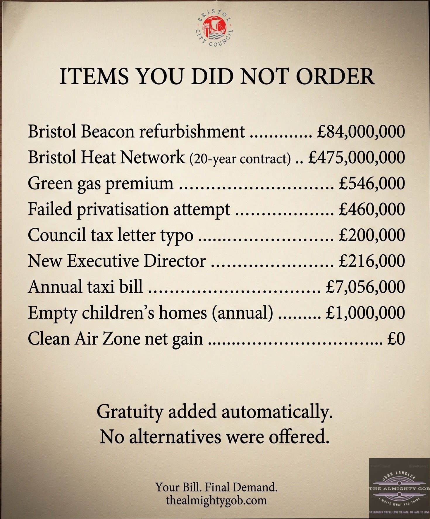 [Bristol City Council’s 2026 satirical budget. Items you did not order. © 2026 John Langley / The Almighty Gob. thealmightygob.com. All rights reserved.]