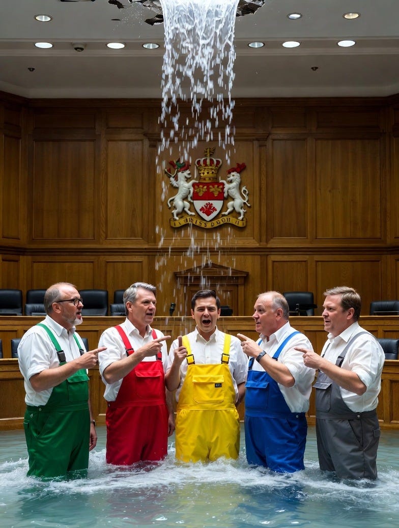 [May 1st, 2026: Five plumbers, all needing unanimous agreement before fixing anything. This is what No Overall Control looks like - committee chairs debating whether the water is wet whilst 14,000 families wait for homes and ambulances can't access streets. Bristol Council chamber, visualised.]