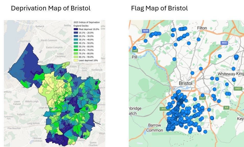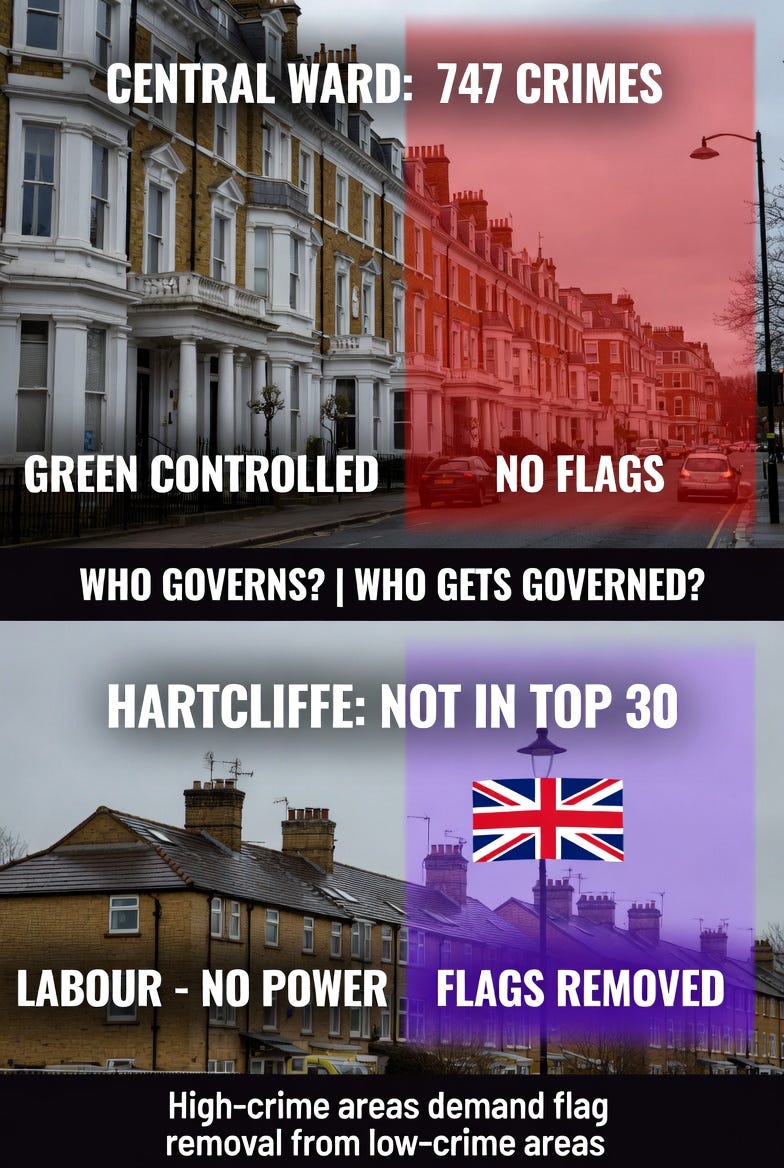 Bristol’s flag controversy—Union Jacks on lampposts, 1,600 petitioners demanding removal, council pledging they’ll “gradually disappear”—looks like standard culture war theatre. Except when you map deprivation against elections against flags against crime statistics, what emerges is a city governed by people insulated from consequences, imposed on people experiencing the failure, justified through claims the actual data proves are total rubbish.