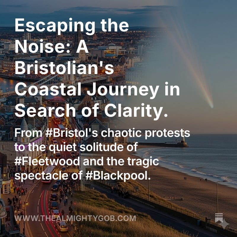 After this journey, I'm left to ponder the stark contrast of what I've seen. From the quiet, historical charm of Fleetwood and the peaceful elegance of Lytham St Annes, this trip has been a microcosm of the world I'm trying to find, rather than the one I'm trying to escape. Yet, a part of my journey to the gaudy, tragic spectacle of Blackpool represents a poignant reminder of the elements I wanted to get away from: the noise, the protests, politics, and everything I despise about life in this societally pollutant world of increasing unrest and chaos.
