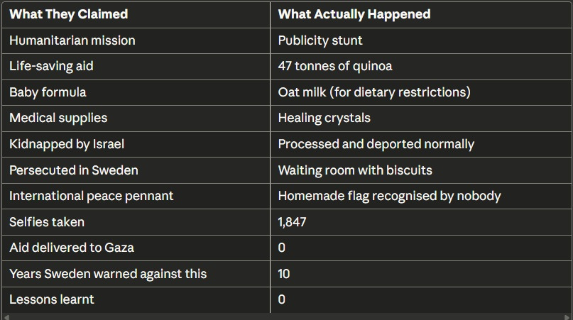 Is this real? Depressingly, yes. The flotilla, the interception, the “selfie yacht” designation, Sweden’s refusal to help—all verified.