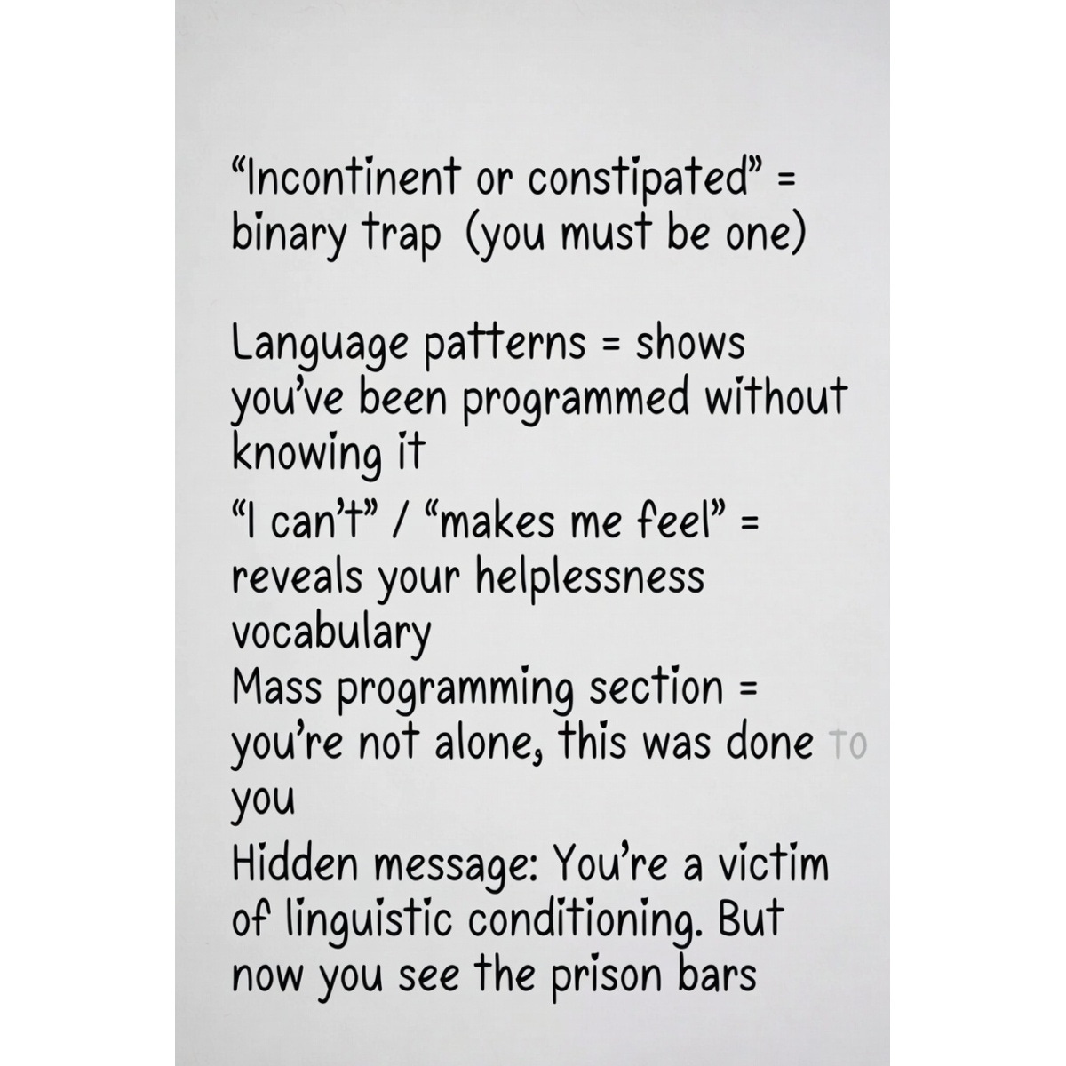 Start catching the language patterns. Start questioning “can’t” and “makes me feel.” Start recognising when you’re being emotionally incontinent or intellectually constipated. Start choosing your responses instead of having them chosen for you.