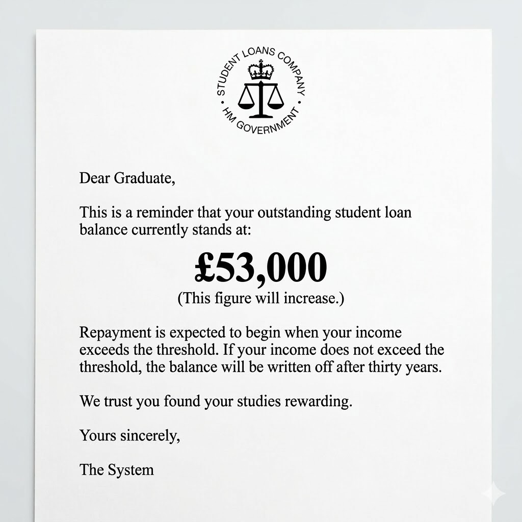 Average graduate debt of £53,000 at point of repayment House of Commons Library, Student Loan Statistics, December 2025 https://commonslibrary.parliament.uk/research-briefings/sn01079/